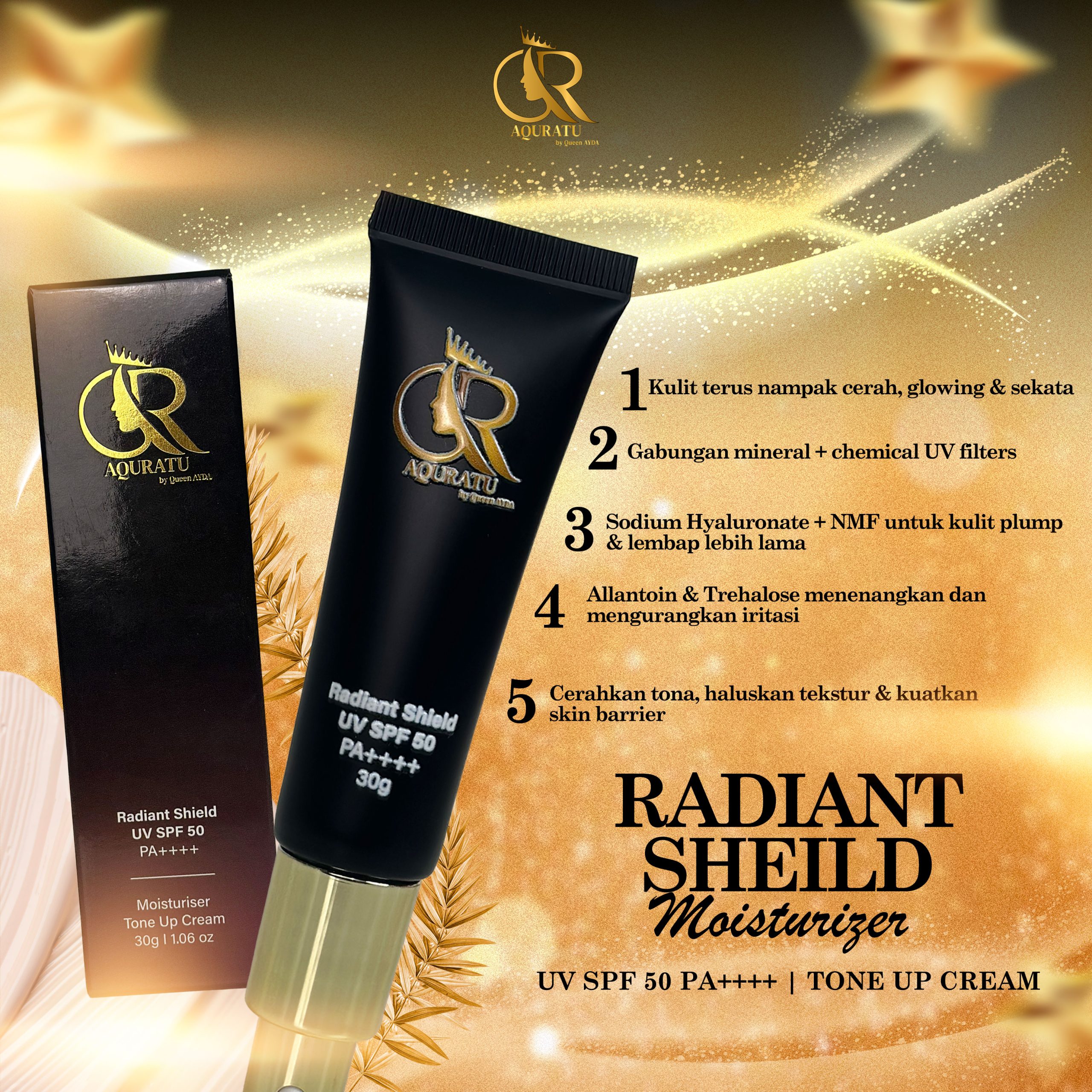 AQURATU Radiant Shield UV SPF 50 ++++ dirancang untuk melindungi kulit anda dari sinaran UV. Dengan SPF 50, ia memberikan perlindungan yang kuat terhadap sinaran UV. Sesuai untuk penggunaan harian, produk ini membantu menjaga kulit anda tetap terlindungi.